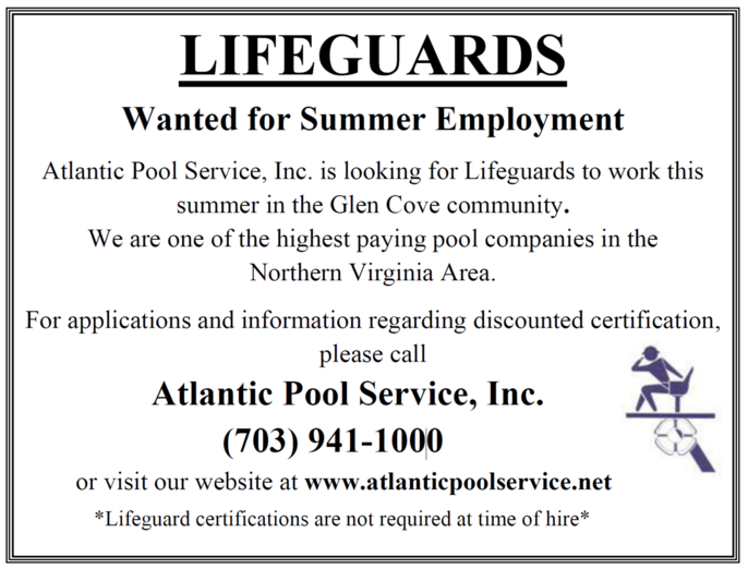 Lifeguards Wanted for Summer Employment- Atlantic Pool Service, Inc. is looking for lifeguards to work this summer at the Glen Cove Community Pool. We are one of the highest paying pool companies in the Northern Virginia Area. For applications and information regarding discounted certification, please call (703) 941-1000 or email at atlanticpoolinc@aol.com *lifeguard certifications are not required at time of hire*